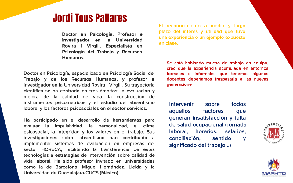 Jordi trabaja para intervenir en todos los factores que afectan la salud ocupacional: horarios, salarios, conciliación, sentido y significado del trabajo. Defiende la importancia de trasladar la experiencia acumulada en entornos profesionales a las nuevas generaciones.
